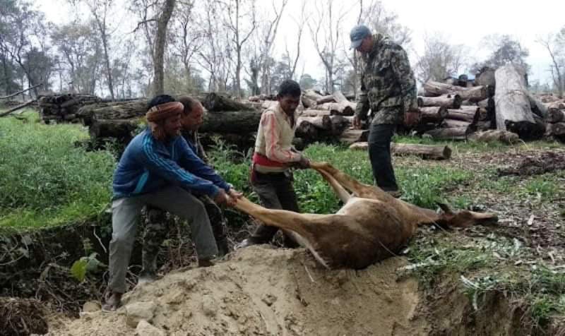 काठमाण्डौ बैशाख १६ गते । रातो तारा डट कम,कपिलवस्तुमा एक साताको अवधिमा दुई वटा निलगाईको हत्या गरिएको छ । लकडाउनको समयपारी सिकारीहरुले निलगाई मारेका हुन् । कपिलवस्तुको कृष्णनगर नगरपालिका ८ लोहोरौलामा एक निलगाइ मृत अवस्थामा प्रहरीले फेला परेको छ । सोमबार दिउँसो १ बजे इलाका प्रहरी कार्यालय वहादुरगन्जको टोलिले जालमा फसेको अवस्थामा फेला परेको थियो । उक्त स्थानबाट दुई वटा मोटरसाइकल समेत बेवारिसे अवस्थामा फेला परेको वहादुगंञ्जका प्रहरी नायव निरीक्षक अभय रावतले बताउनुभयो । लु २५ प ५२२९ र लु २ प २३ नम्बर मोटरसाइकल बरामद गरिएको रावतले बताउनुभयो । प्रहरिले मृतक निलगाइ र मोटरसाइकल डिभिजन बन कार्यालय गौतमबुद्वलाई बुझाएको छ । त्यस्तै वैशाख १० गते बुधवार महाराजगंज नगरपालिका ९ जितपुरमा गोलि लागेको अवस्थामा फेला परेको थियो । स्थानीय किसानले गोली लागि मरेको अवस्थामा निलगाई देखेपछि प्रहरीलाइ खबर गरेका थिए । वैशाख १ गते पनि महाराजञ्जमै एक नलिगाई मरेको अवस्थामा फेला परेको थियो । तीन वटै घटना संम्लग्न व्यक्ति फेला नपरेको डिभिजन वन कार्यालय गौतमबुद्धका वन अधिकृत दुर्गा बहादुर कार्कीले बताउनुभयो । घटनावारे अनुसन्धान भइरहेको उहाँले बताउनुभयो ।
